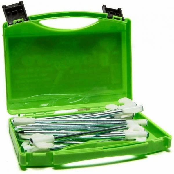 These pegs are packed in twenties within a robust plastic storage case, designed to effectively safeguard them against>