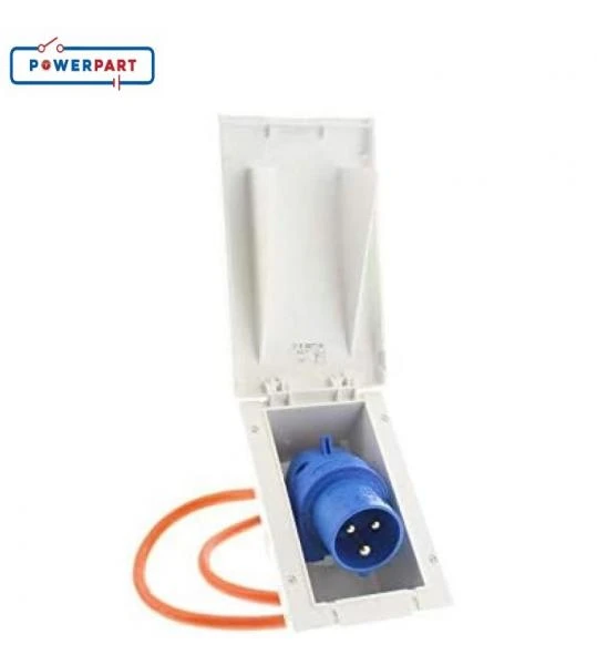 White TND 240VAC flush mains inlet box. Rectangular version where the plug pivots out a little when in use.