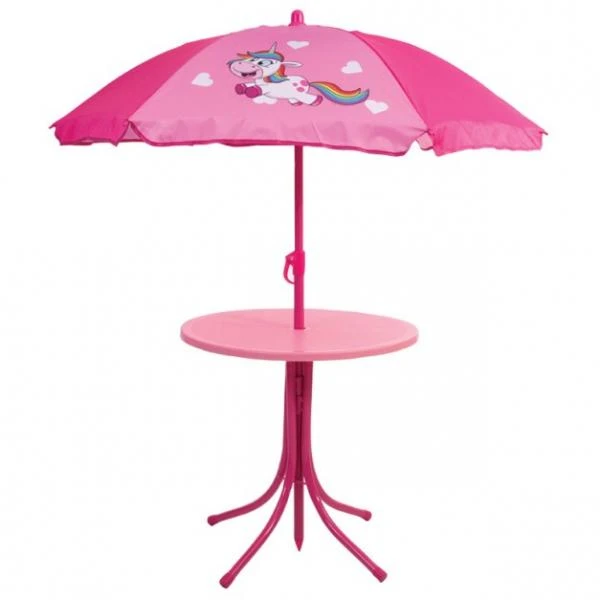 This is a charming outdoor furniture set featuring a whimsical unicorn design that will add a touch of magic to any outdoor setting. This set includes two comfortable and sturdy unicorn-themed chairs, a table and a matching parasol to provide shade on sunny days. The chairs feature a safety lock to help stop fingers getting trapped and fold flat when not in use so they are easy to carry and store. The Umbrella provides ample shade and the>
