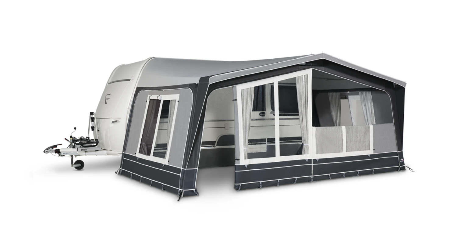 The Dorema Diamond XL270 Full Caravan Awning takes the same features as the Diamond 240 and extends its depth to 270 cm, offering even more space for campers who require additional room. Like its smaller counterpart, the XL270 is designed for both seasonal and touring use, ensuring reliable performance year-round. The roof is made from durable TenCate All Season coated polyester, with a printed pattern design on the inside that adds a touch of style to the interior.