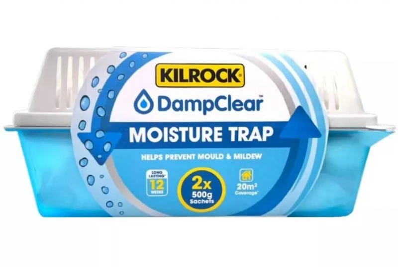 The Kilrock Damp Clear Moisture Traps are a highly effective way to remove excess moisture from your home. The moisture trap protects against mould and mildew, Improves air quality and reduces damp odours which protects your home and contents from damp damage & Makes it harder for mould and mildew to thrive. The Moisture Trap is>Carefully take the full Damp Clear Moisture Trap to a sink and pour the liquid contents of the blue base through the corner spout. Wipe any drips with a paper towel.