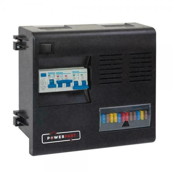 There are 12 separate fuse protected outputs for: Auxiliary, Lights, Hob/Oven, Heater, Pump/toilet, Control Panel Ignition, Control Panel Perm, Fridge, Fridge 3S, Permanent, Leisure Battery, Vehicle Battery.